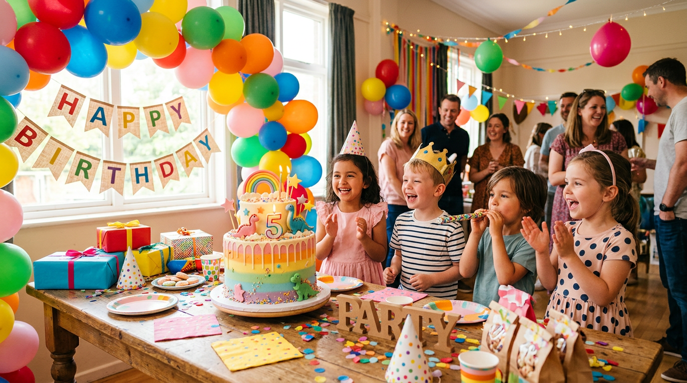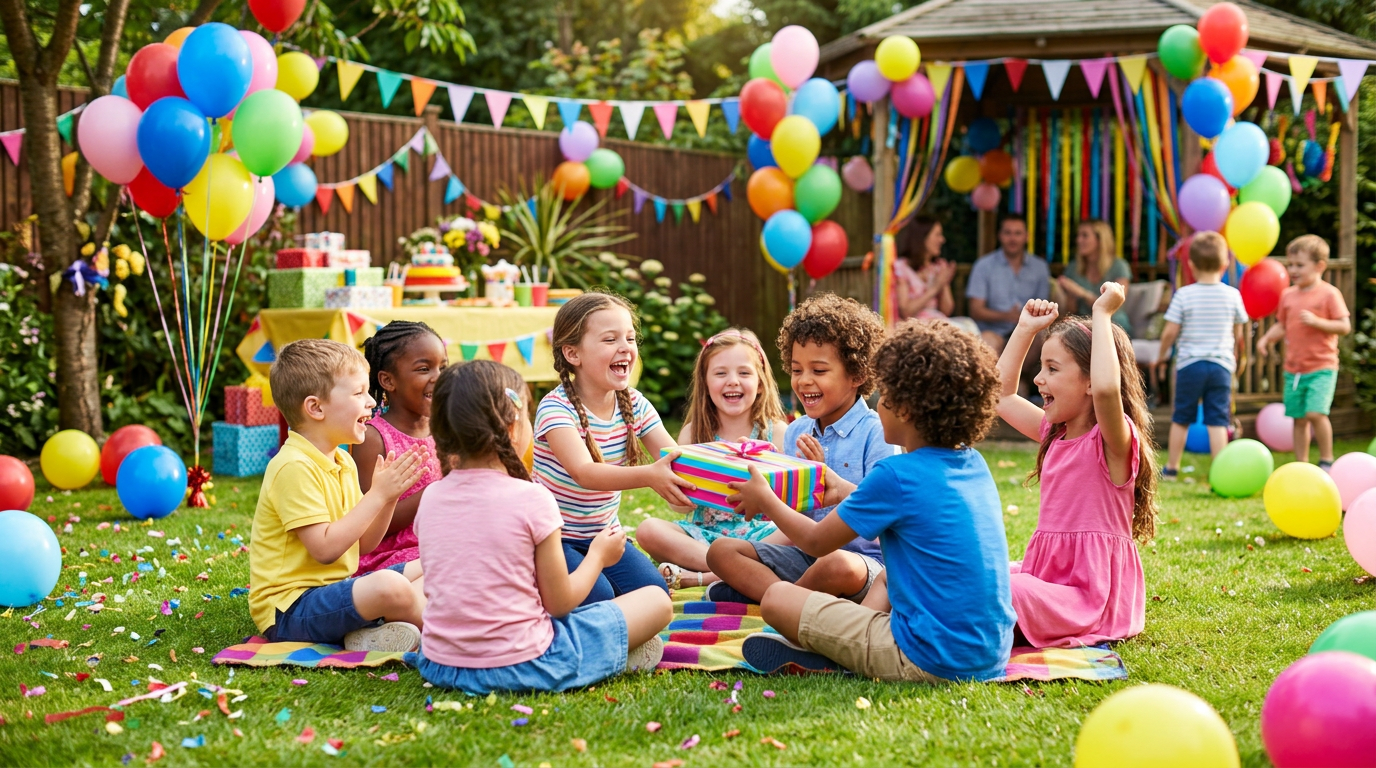 Décor & play: Pick 2 main games + 1 backup → Order or buy theme decorations (balloons, banner, tableware). By age: 3–5 = simple games (musical statues, treasure hunt, one craft); 6–8 = mix of active + creative; 9+ = scavenger hunt, sports, photo booth.