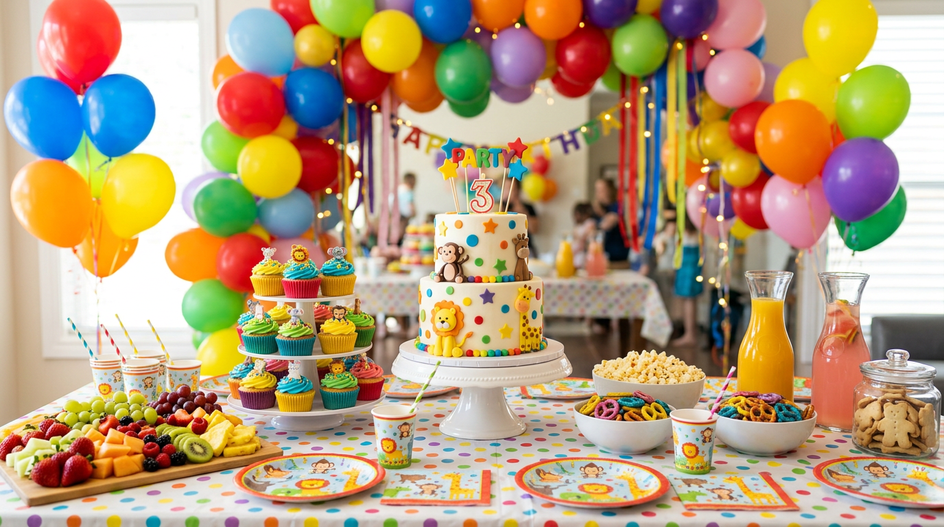 - Choose one theme — Toddlers: animals, farm, bubbles. 4–6: superheroes, princesses, dinosaurs. 7–9: sports, science, Minecraft. 10+: pool, movie night, escape room.